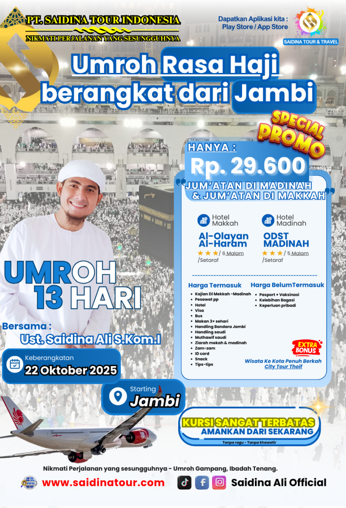 Saidina Tour & Travel adalah perusahaan Travel professional yang telah berjalan 10 tahun lebih. Kami memiliki pengalaman yang luas dalam mengatur perjalanan umrah. Dengan pengetahuan yang mendalam tentang proses dan persyaratan umrah, kami dapat memastikan bahwa perjalanan Anda berjalan lancar dan tanpa kesulitan.